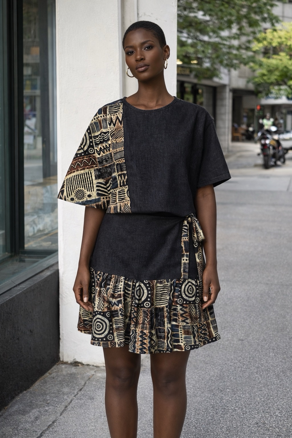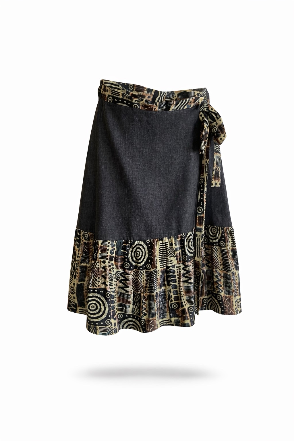 Premium statement denim wrap skirt with unique tribal accents, designed for bold everyday style.